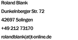 Alle Inhalte dieser Webseite, insbesondere Texte, Fotografien und Grafiken, sind urheberrechtlich geschützt. Alle Rechte sind vorbehalten. Das Urheberrecht liegt, soweit nicht ausdrücklich anders gekennzeichnet bei Roland Blank. Mit Ausnahme der ggf. angebotenen Downloads zur Verwendung in der Originalfassung, verstößt die Verwendung der Fotos, Texte, Grafiken etc. – auch auszugsweise – ohne meine vorherige schriftliche Genehmigung gegen die Bestimmungen des Urheberrechts und ist damit rechtswidrig. Dies gilt insbesondere auch für alle Verwertungsrechte wie die Vervielfältigung, die Weiterverarbeitung oder die Verwendung in elektronischen Systemen. Bitte fragen Sie mich, falls Sie die Inhalte dieser Webseite verwenden möchten.